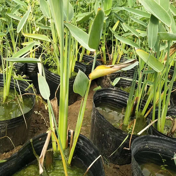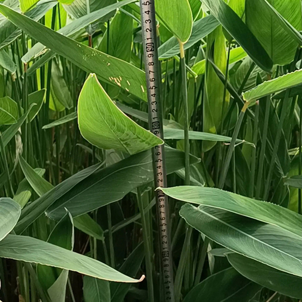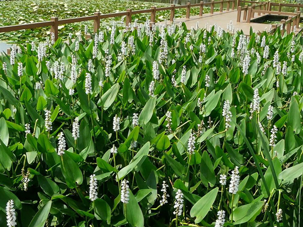 再力花(學名:Thalia dealbata Fraser):竹芋科,再力花屬多年生挺水草本植物。葉卵狀披針形,淺灰藍色,邊緣紫色,長50厘米,寬25厘米。復總狀花序,花小,紫堇色。全株附有白粉。